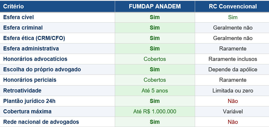 Após quase uma década analisando perfis de risco de médicos e dentistas em todo o Brasil, a Seguremed chegou a uma conclusão consistente: para a grande maioria dos profissionais de saúde que atuam no Brasil em 2026, o FUMDAP da ANADEM oferece uma proteção significativamente mais completa do que o RC convencional isolado.